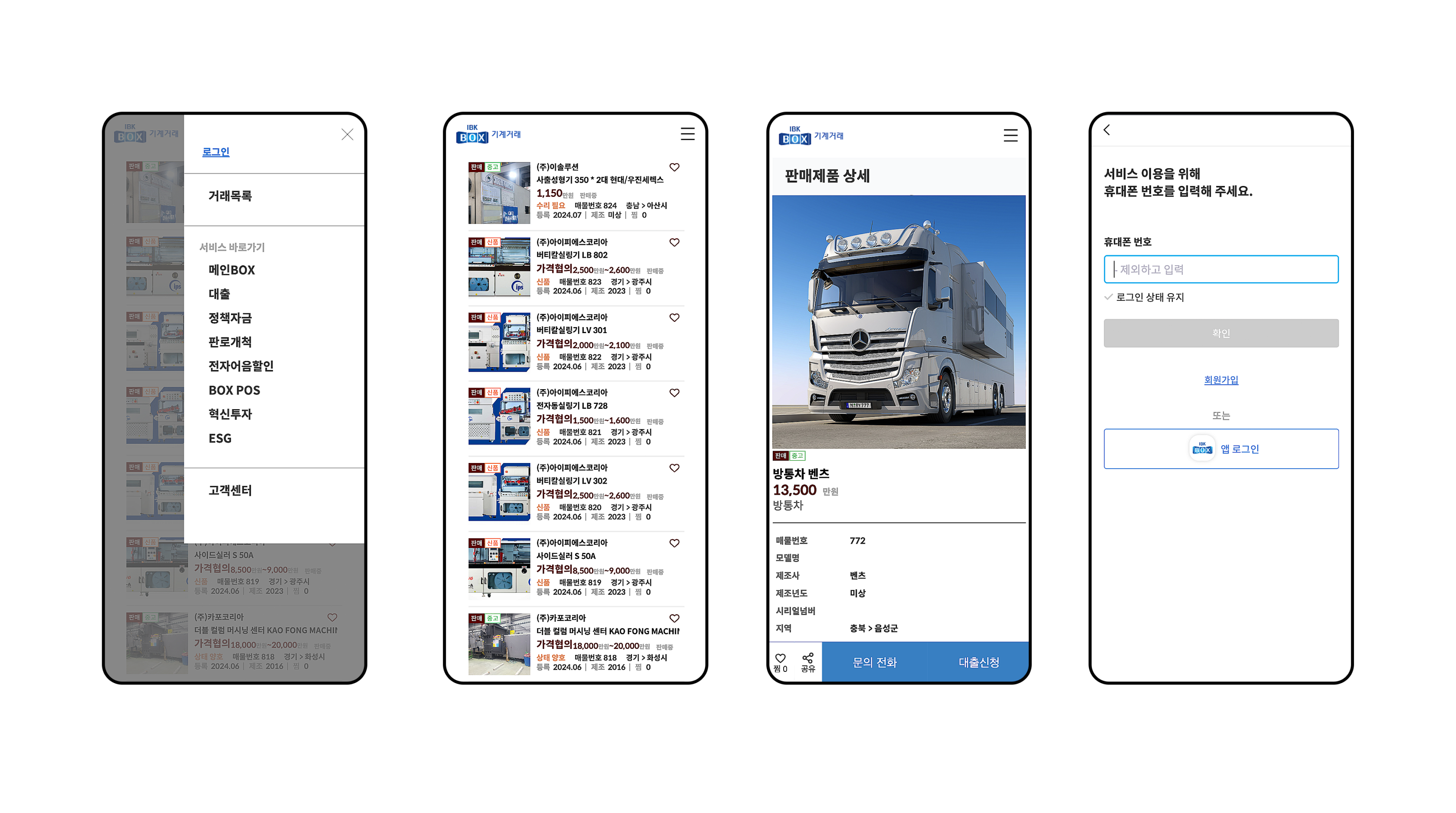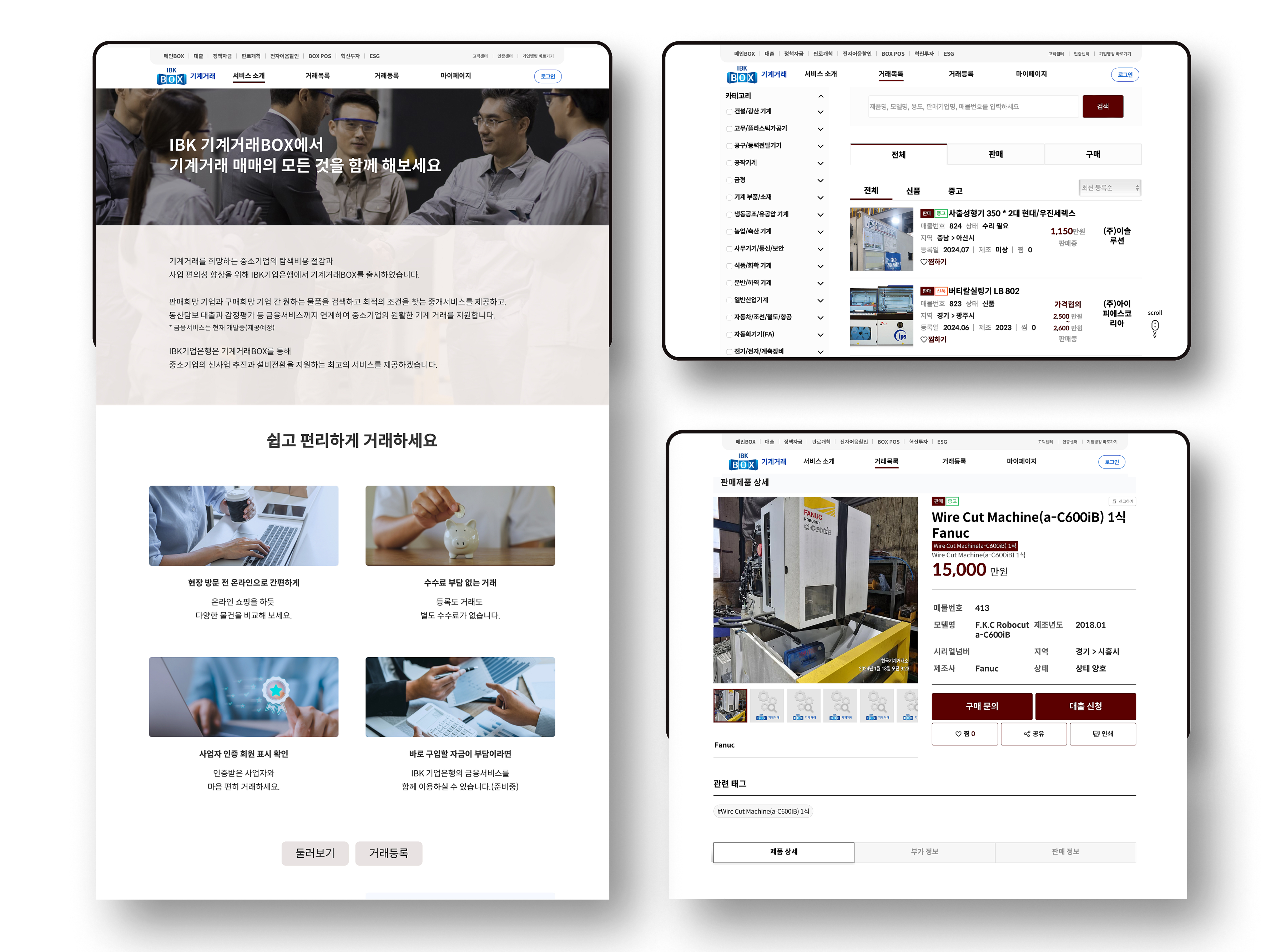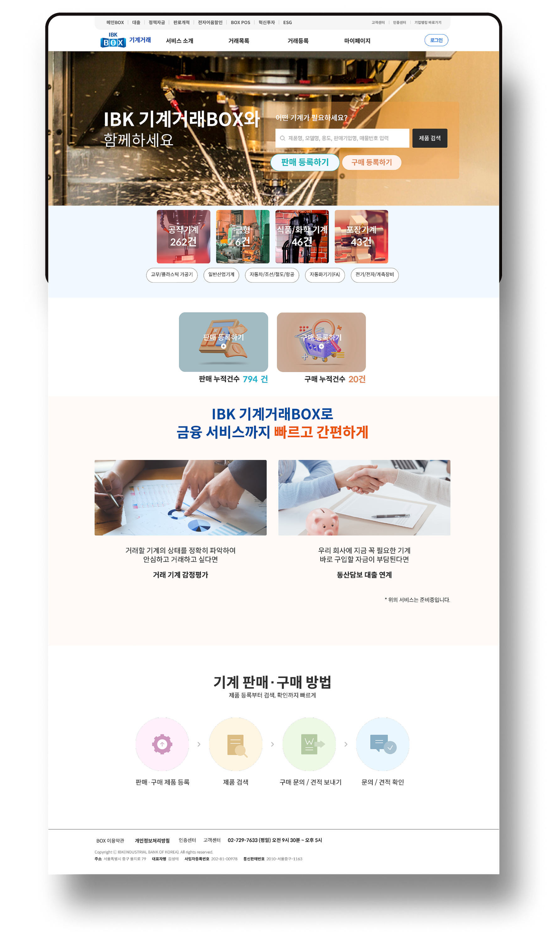 IBK기업은행의 기계거래BOX는 누구나 손쉽게 관심있는 제품 구매 및 판매를 할 수 있는 IBK만의 기계거래 전문 플랫폼입니다. 사용자 친화적인 디자인 및 이해하기 쉬운 용어와 이미지를 활용해 디지털 거래에 익숙하지 않은 고객도 쉽게 이용 가능하고, 간편 검색어 기능을 통해 매물검색의 편의성도 높였습니다.