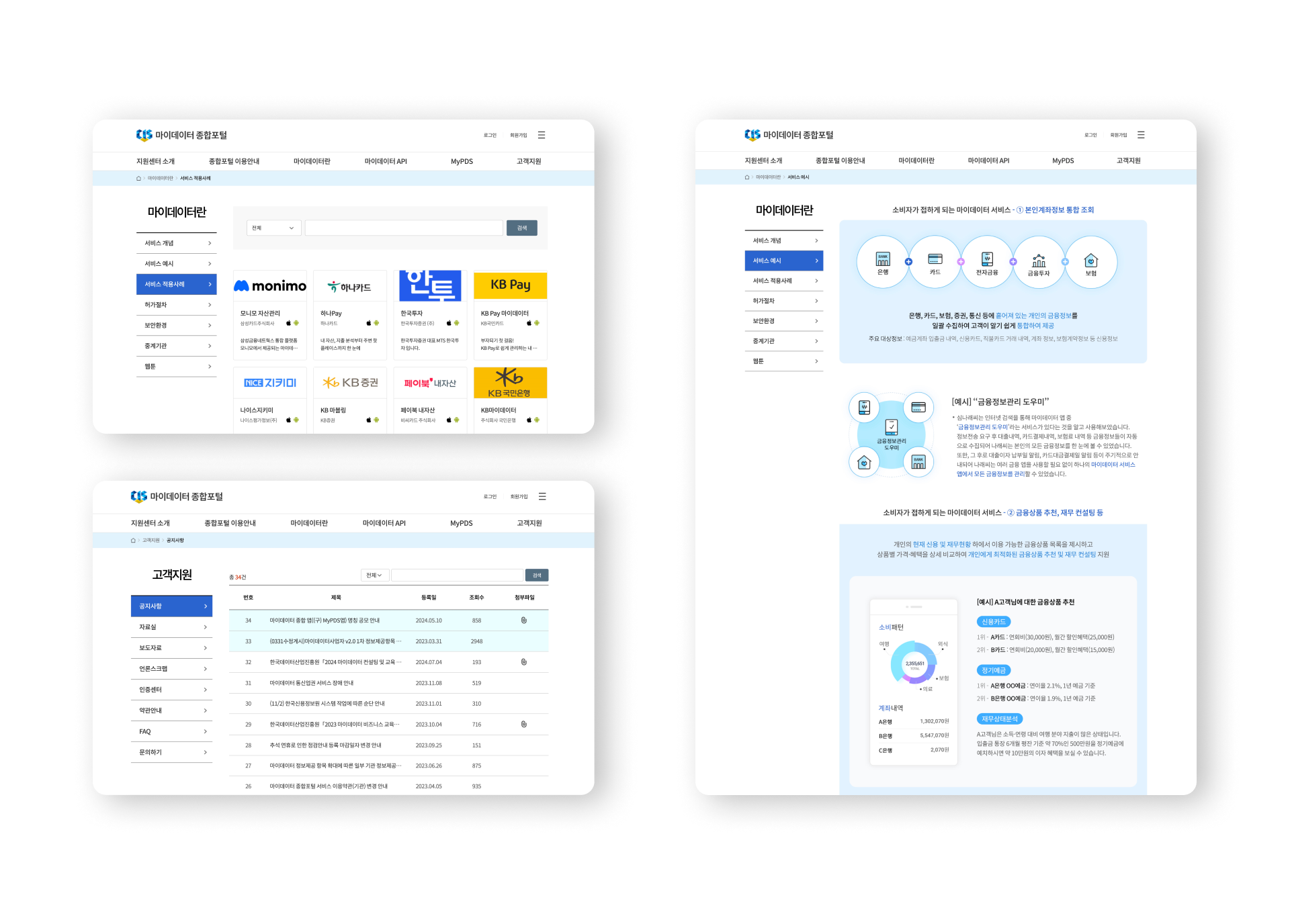 공공 마이데이터는 정보주체인 국민의 요구에 따라 행정·공공기관이 보유한 본인정보를 본인 또는 제3자에게 제공하는 서비스로서 해당 서비스로 인해 국민의 금융 서비스 이용 편의성과 금융기관의 업무 효율성에 목적을 두고 구축하였습니다.