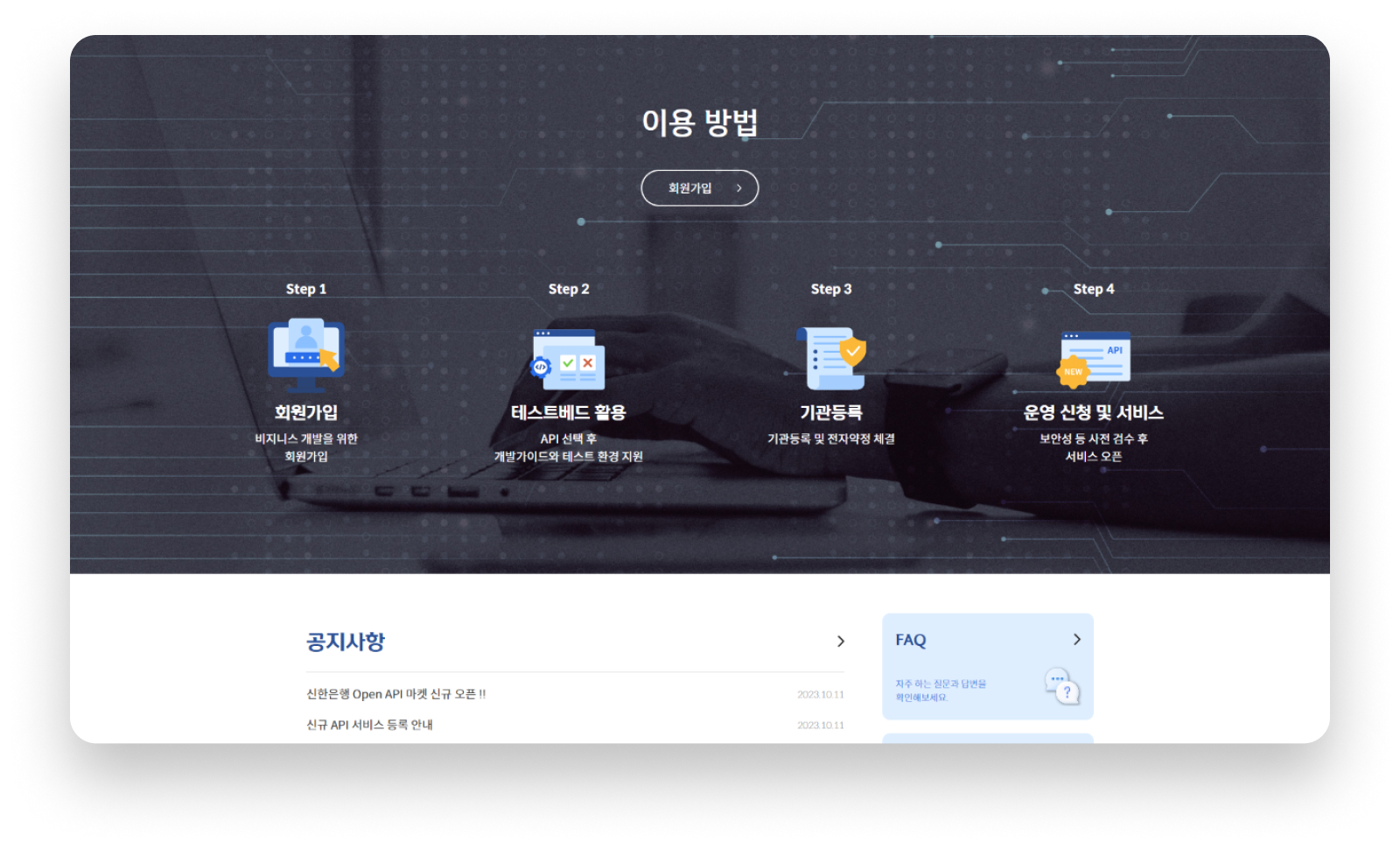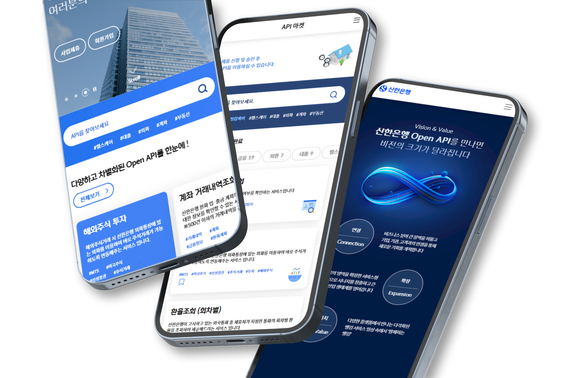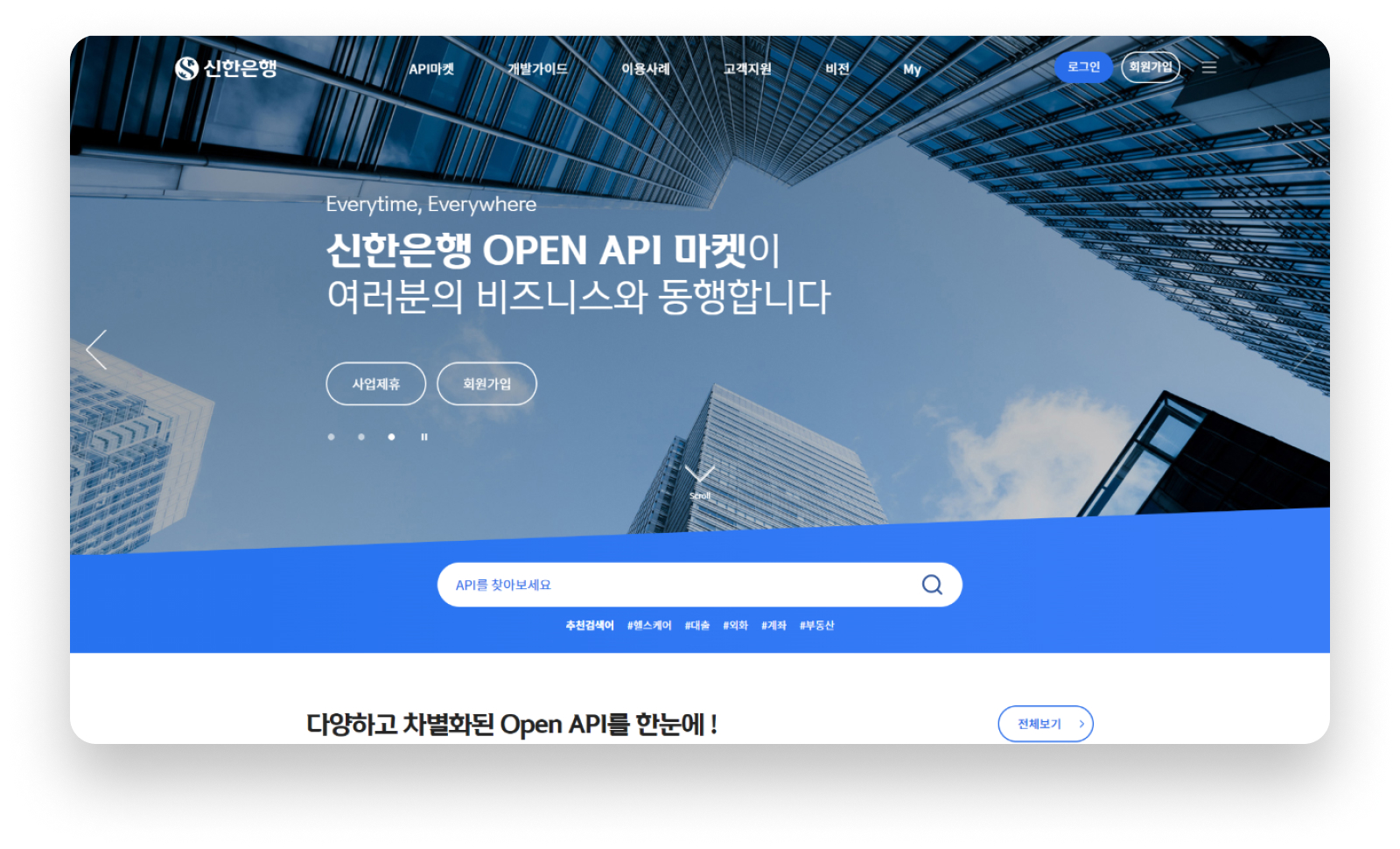 신한은행의 자체 Open API 마켓으로 금융권 최초로 ChatGPT를 활용한 API 개발지원, 코딩 오류체크 등 특성화된 AI 서비스를 접목했으며 헬스케어, 프롭테크 등 다양한 분야의 327개 Open API를 제공하는 포털 사이트입니다.