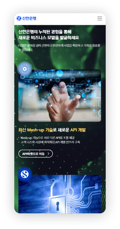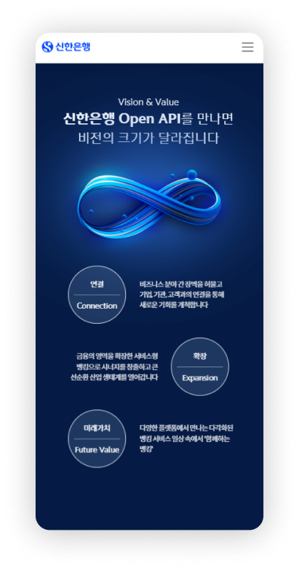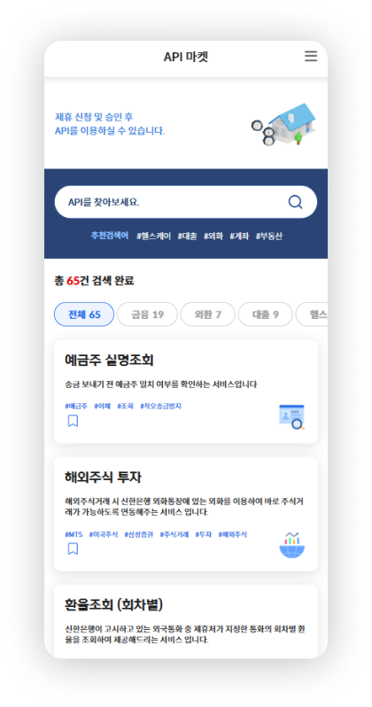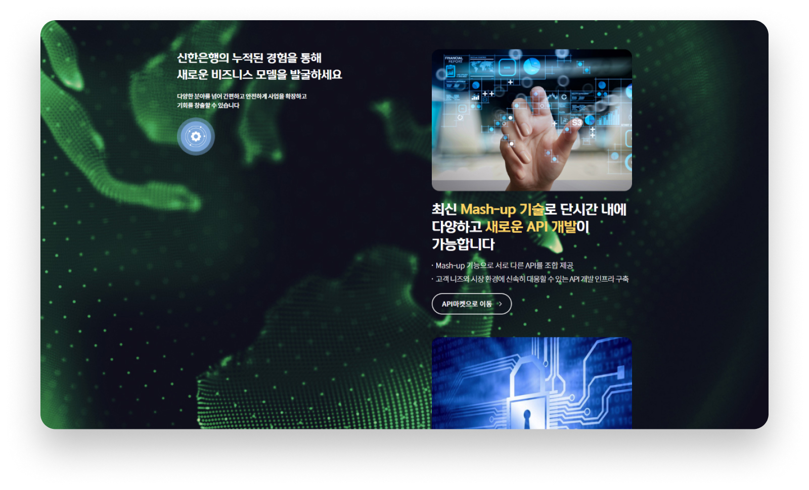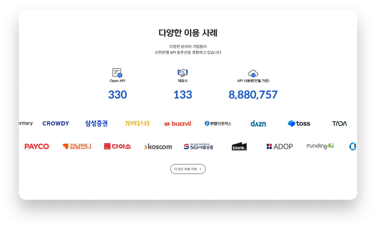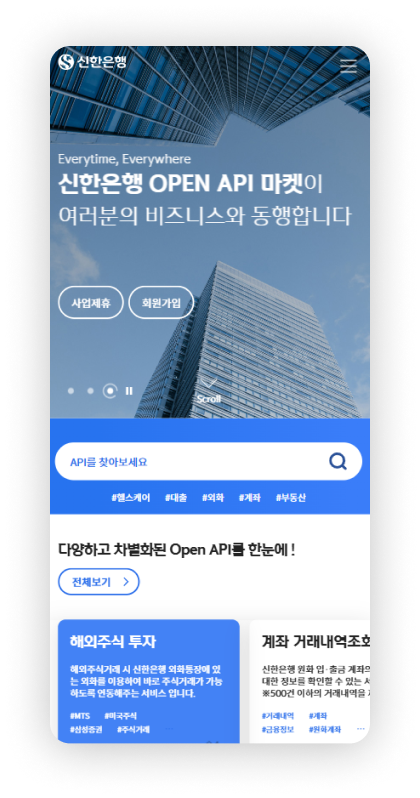 신한은행의 자체 Open API 마켓으로 금융권 최초로 ChatGPT를 활용한 API 개발지원, 코딩 오류체크 등 특성화된 AI 서비스를 접목했으며 헬스케어, 프롭테크 등 다양한 분야의 327개 Open API를 제공하는 포털 사이트입니다.